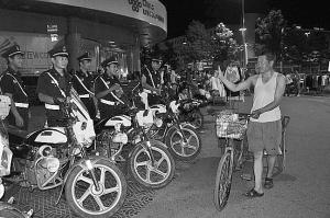 保安隊員夜間巡邏,受到過往群眾翹指稱贊。