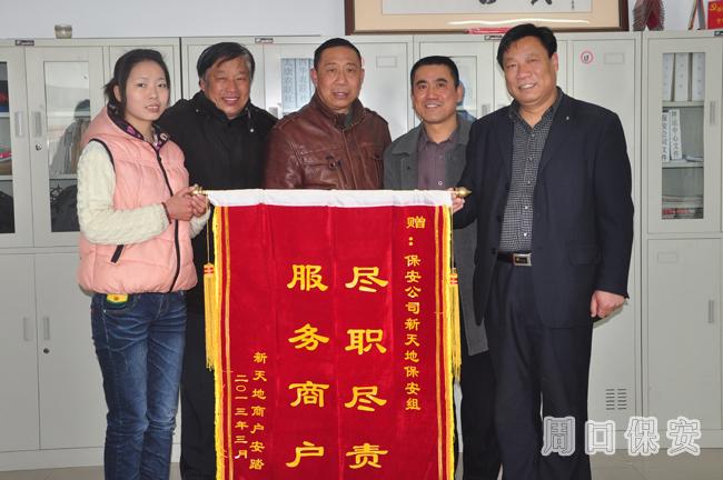 2013年3月13日下午15時(shí)左右,周口市保安公司人防一大隊(duì)新天地崗點(diǎn)保安員周元敬等四人正地進(jìn)行安保巡邏,當(dāng)他們巡邏至新天地安踏虎痁門前時(shí),發(fā)現(xiàn)一名男子正在撬一輛三輪電動(dòng)車的車鎖,保安員及時(shí)上前,那名盜車男子見狀倉惶逃走,被撬三輛電動(dòng)車鎖已被破壞,而那輛三輪電動(dòng)車卻幸免沒有盜走。正是新天地幾名保安員的認(rèn)真負(fù)責(zé)和堅(jiān)持履職的負(fù)責(zé)精神,不僅保護(hù)了客戶的財(cái)產(chǎn)安全,而且贏得了客戶們的一致好評(píng)。3月14日,新天地安踏虎店老板送來繡有“服務(wù)商戶 盡職盡責(zé)”的錦旗一面,并表達(dá)了對(duì)保安員的一片感激之情。