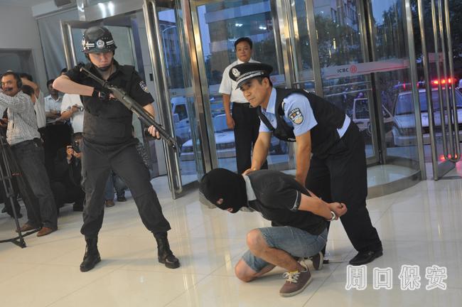 省工行保衛(wèi)部副總經(jīng)理高洪、井曉明,市工行銀行王勇行長、保衛(wèi)部高紅領(lǐng)經(jīng)理、工行營業(yè)部行長方萬海及河南省18個地市工行保衛(wèi)部經(jīng)理共同觀摩了這次演練,周口市保安服務(wù)公司擔(dān)負了這次演練任務(wù),圖為演練現(xiàn)場。