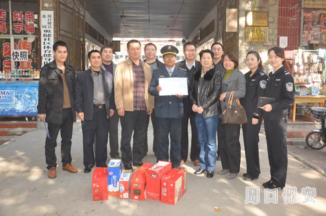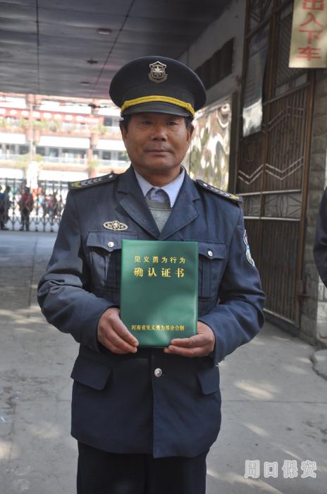2013年11月7日上午,周口市公安局基金會王秘書長、荷花派出所張局長、孫主任及周口市保安服務(wù)公司黨支部書記鄭明山、人防經(jīng)理任萍、辦公室主任王林杰等一行,前往周口七一路閆莊小學(xué),向周口市保安服務(wù)公司閆莊小學(xué)保安馬忠堂送來了“見義勇為”行為確認證書及慰問品。