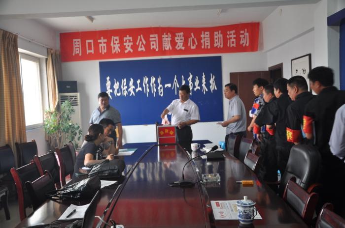 2014年6月9日上午,周口市保安服務公司管理人員在公司會議室舉辦了“向張宜兵同志先進事跡學習動員會”,并為他進行了捐款活動。會上,保安公司韓總經(jīng)理倡儀公司大力開展保安大討論活動,旨在通過討論活動,讓廣大保安員認識到自身職責作用,提高社會各界對保安人員的認識度。