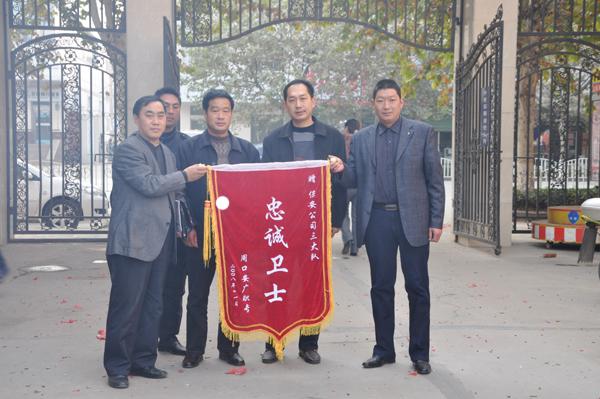 11月 9日上午,周口保安公司院內(nèi)鞭炮齊鳴,喜氣洋洋,周口市安廣職專的校方領(lǐng)導(dǎo)來到保安公司院內(nèi),向公司送來了一面題有“忠誠衛(wèi)士”的錦旗!
