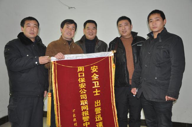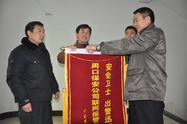 11月30日上午,保安公司院內(nèi)鞭炮齊鳴,喜氣洋洋,一名中年男子手拿一面刻有“安全衛(wèi)士、出警迅速”的錦旗送到周口市保安服務(wù)公司,向公司技防出警人員表示感謝!