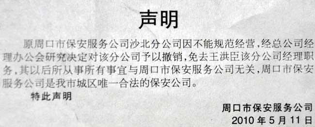 2010年5月14日,周口日?qǐng)?bào)B1版刊登聲明:原周口市保安服務(wù)公司沙北分公司因不能規(guī)范經(jīng)營(yíng),經(jīng)總公司經(jīng)理辦公會(huì)研究決定對(duì)該分公司予以撤銷,免去王洪臣該分公司經(jīng)理職務(wù),其以后所從事所有事宜與周口市保安服務(wù)公司無(wú)關(guān),周口市保安服務(wù)公司是我市城區(qū)唯一合法的保安公司。