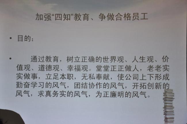 總經(jīng)理助理耿學(xué)爭(zhēng)向大家講述了公司為什么要開(kāi)展“四知”教育、“四知”的內(nèi)容及其關(guān)系、怎樣入腦入心做合格員工三個(gè)主要內(nèi)容。他生動(dòng)、深刻、形象的講解,得到了大家的陣陣掌聲,使大家更充分地認(rèn)識(shí)到,通過(guò)“四知”教育,樹(shù)立正確的世界觀、人生觀、價(jià)值觀、道德觀、幸福觀。堂堂正正做人,老老實(shí)實(shí)做事,立足本職,無(wú)私奉獻(xiàn),使公司上下形成勤奮學(xué)習(xí)的風(fēng)氣,團(tuán)結(jié)協(xié)作的風(fēng)氣,開(kāi)拓創(chuàng)新的風(fēng)氣,求真務(wù)實(shí)的風(fēng)氣,為正廉明的風(fēng)氣。