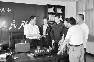 周口市保安服務公司商水分經(jīng)理楊書杰(左一)在安排部署工作