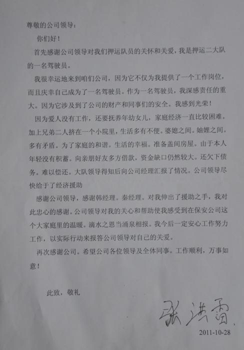 事后,押運(yùn)隊(duì)員張洪雷寫了一封感謝信交到公司,表達(dá)對(duì)公司領(lǐng)導(dǎo)的感激之情,表示今后一定要繼續(xù)努力工作,為公司的進(jìn)一步發(fā)展做貢獻(xiàn)。