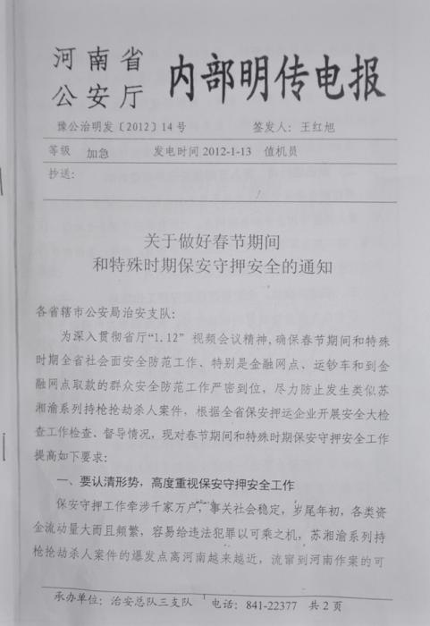 為深入貫徹省廳“1.12”視頻會(huì)議精神,確保春節(jié)期間和特殊時(shí)期全省社會(huì)面安全防范工作、特別是金融網(wǎng)點(diǎn)、運(yùn)鈔車(chē)和到金融網(wǎng)點(diǎn)取款的群眾安全防范工作嚴(yán)密到位,盡力防止發(fā)生類(lèi)似蘇湘渝系列持槍搶劫殺人案件,根據(jù)全省保安押運(yùn)企業(yè)開(kāi)展安全大檢查工作檢查、督導(dǎo)情況,現(xiàn)對(duì)春節(jié)期間和特殊時(shí)期保安守押安全工作提高如下要求: