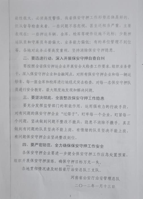保安守押工作牽涉千家萬(wàn)戶,事關(guān)社會(huì)穩(wěn)定,歲尾年初,各類(lèi)資金流動(dòng)量大而且頻繁,容易給違法犯罪以可乘之機(jī),蘇湘渝系列持槍搶劫殺人案件的爆發(fā)點(diǎn)離河南越來(lái)越近,流竄到河南作案的可能性很大,必須高度警惕。我省保安守押工作形勢(shì)總體是好的,但從督導(dǎo)檢查來(lái)看,一些問(wèn)題不容忽視,甚至還相當(dāng)嚴(yán)重,主要表現(xiàn)在:一些押運(yùn)車(chē)輛、金庫(kù)、槍庫(kù)等硬件設(shè)施不達(dá)標(biāo);少數(shù)押運(yùn)隊(duì)員和守庫(kù)員年齡偏大、業(yè)務(wù)能力偏低;有的單位管理不到位等。各地對(duì)此務(wù)必要高度重視,堅(jiān)持消除保安守押隱患。