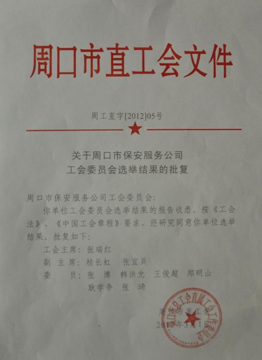 經(jīng)周口市保安服務(wù)公司申請(qǐng),并根據(jù)周口市總工會(huì)直屬工會(huì)工作委員會(huì)批復(fù),公司自2012年3月1日起建立周口市保安服務(wù)公司工會(huì)委員會(huì),并依法開展工作。