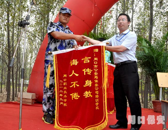 會(huì)上,職業(yè)技術(shù)學(xué)院領(lǐng)導(dǎo)將一面寫(xiě)著“言傳身教 誨人不倦”的錦旗贈(zèng)送保安公司培訓(xùn)學(xué)校教官,表達(dá)了對(duì)參訓(xùn)教官的敬意。