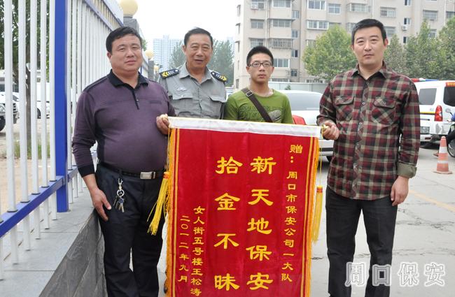 2012年9月26日,市民王先生將一面“新天地保安 拾金不昧 ”的錦旗,送到周口保安服務(wù)公司保安員手中,感謝四名保安人員拾金不昧的高尚品德,為他挽回了損失。