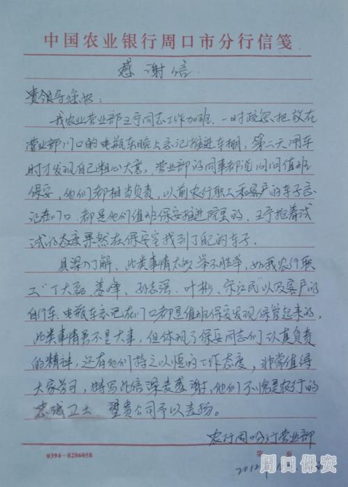 2012年10月29日,周口市保安服務公司院內(nèi)鞭炮齊鳴,來自我市中國農(nóng)業(yè)銀行某行點的王寧向保安公司送來了錦旗和感謝信致謝。
