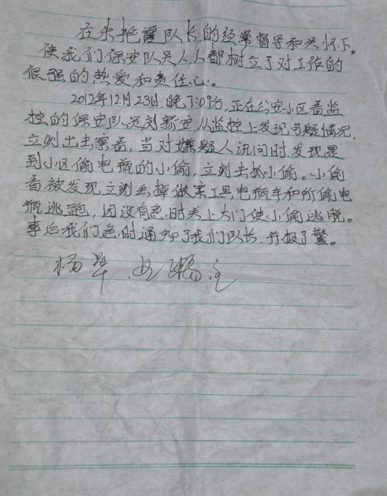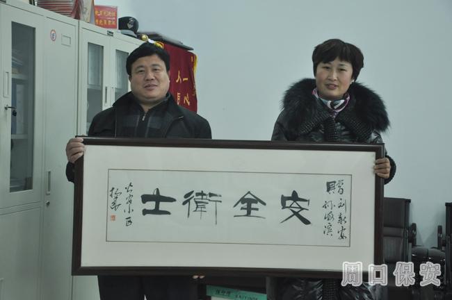 2012年12月26日上午9時(shí),周口市公安小區(qū)業(yè)主楊華帶著印有“安全衛(wèi)士”的牌匾和一封感謝信來到周口市保安服務(wù)公司,講述了十大隊(duì)保安隊(duì)員劉新安見義勇為、一心為民的先進(jìn)事跡,并對(duì)保安公司培養(yǎng)出這么優(yōu)秀的保安隊(duì)員表示感謝。