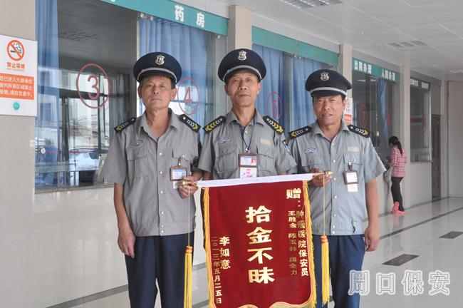 2013年5月23日,駐周口市中心醫(yī)院保安員王勝全、陳玉林、周全力在巡邏時(shí),在存車棚內(nèi)撿錢包一個(gè),內(nèi)有現(xiàn)金3萬余元,及醫(yī)療本、身份證、銀行卡等證件??紤]到失主一定非常著急,醫(yī)院保安大隊(duì)保安迅速排查,終于找到了失主李如意。