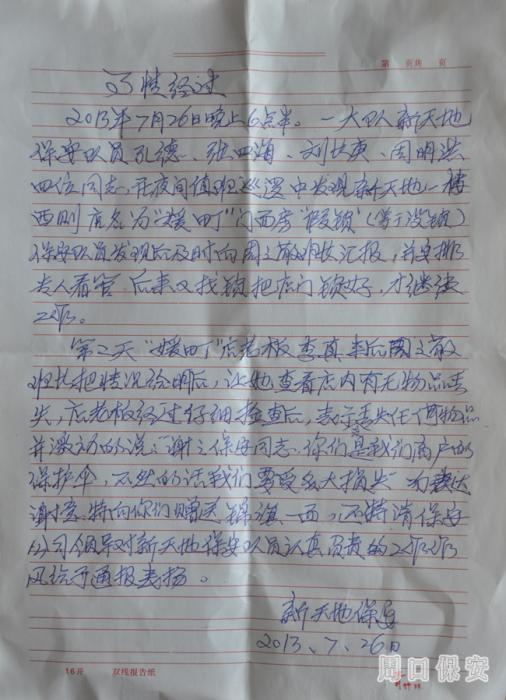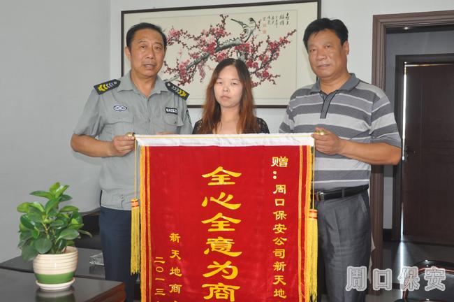 2013年7月31日,周口市新天地商戶李真來到保安公司,送來一面繡有“全心全意為商戶服務(wù)”的錦旗和一封感謝信,大力贊揚保安服務(wù)公司駐新天地保安員孔德、張四海、劉長庚、周明鴻四名隊員工作認(rèn)真負(fù)責(zé)、無私服務(wù)客戶的精神。